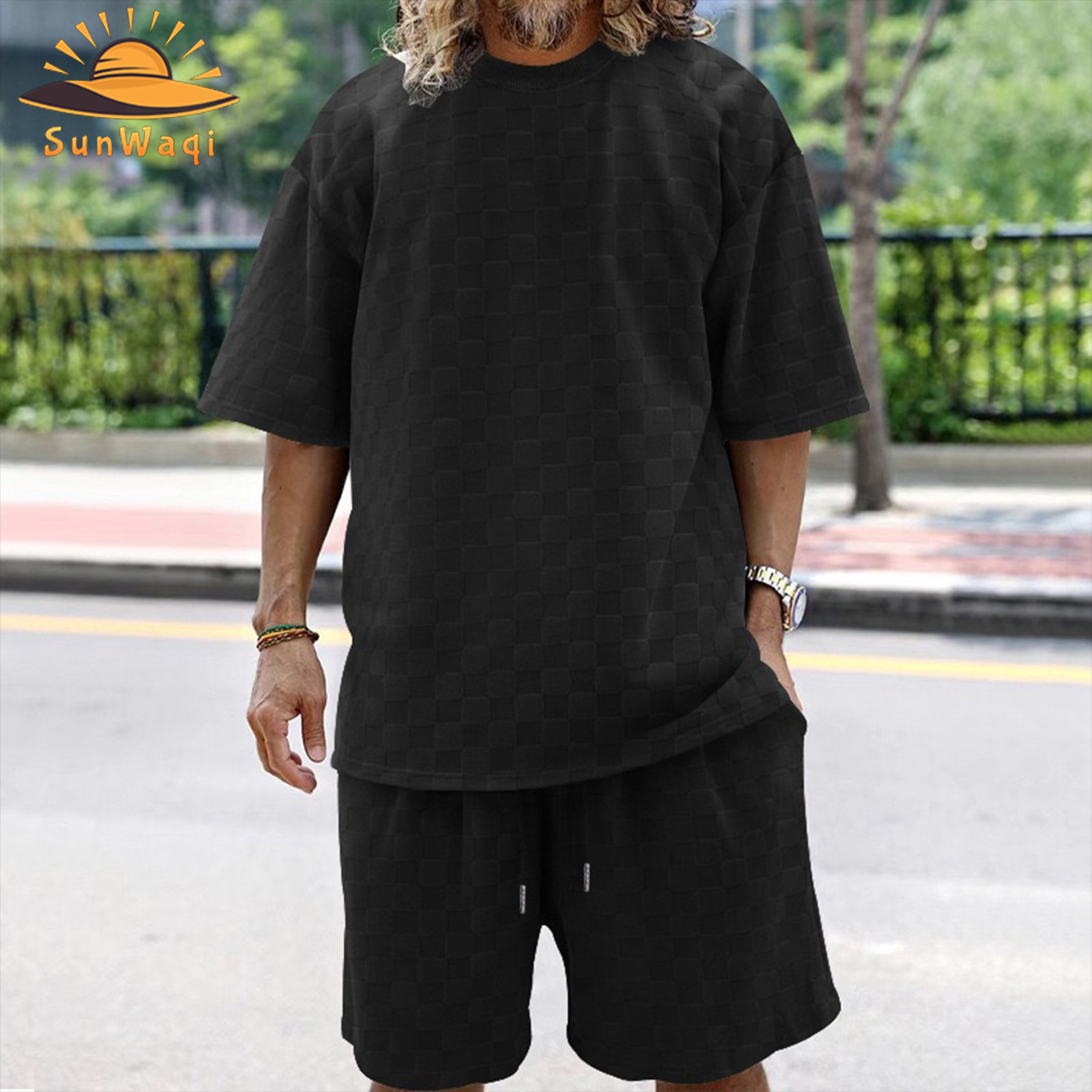 SunWaqi Men's Summer Casual Solid Color Jacquard Drop-Shoulder Extra Wide Loose T-Shirt And Shorts Set. Black.