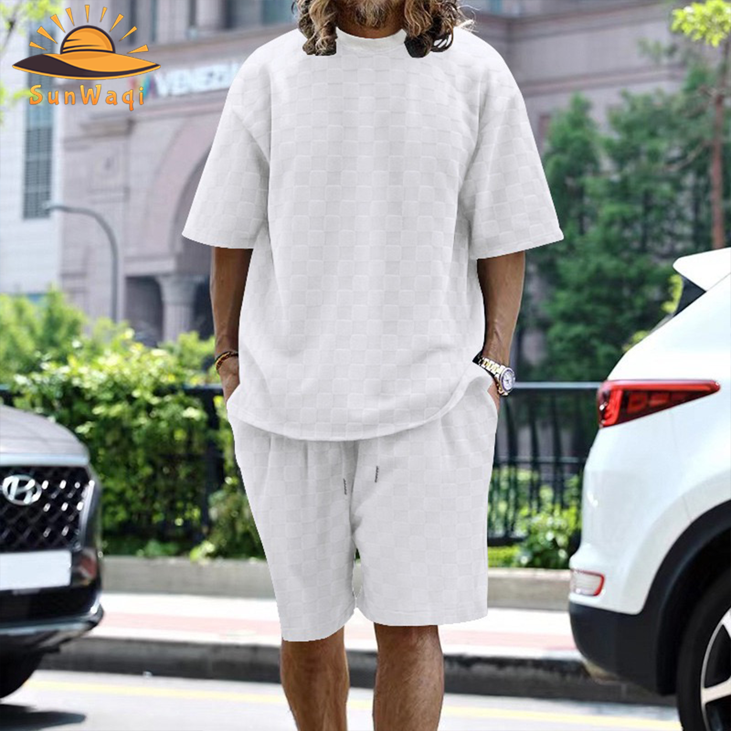 SunWaqi Men's Summer Casual Solid Color Jacquard Drop-Shoulder Extra Wide Loose T-Shirt And Shorts Set. White.